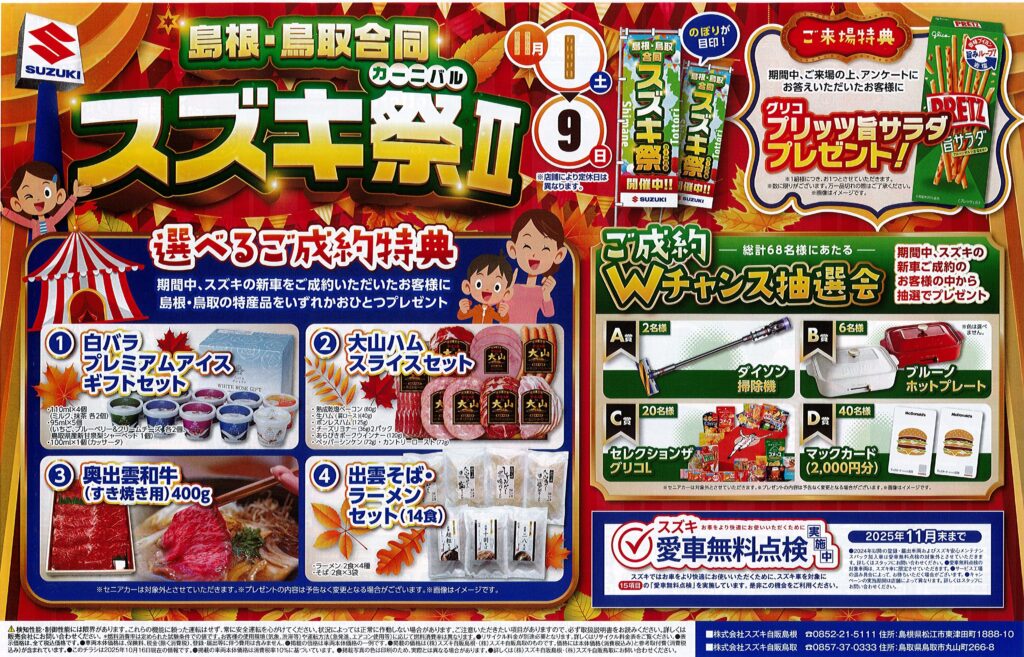 期間中、スズキの新車をご成約いただいたお客様に島根・鳥取の特産品をいずれかおひとつプレゼント!