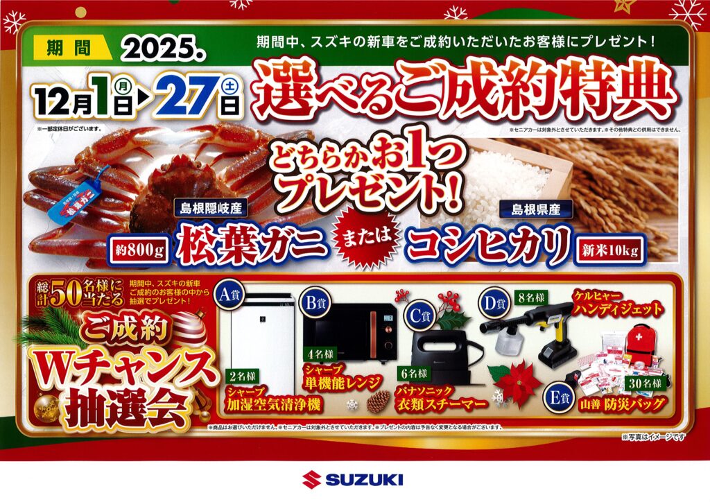 期間中、スズキの新車ご成約のお客様の中から抽選でプレゼント!