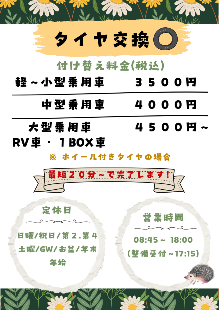 弊社のタイヤ交換料金表をぜひご参考にされてください☺️⇩