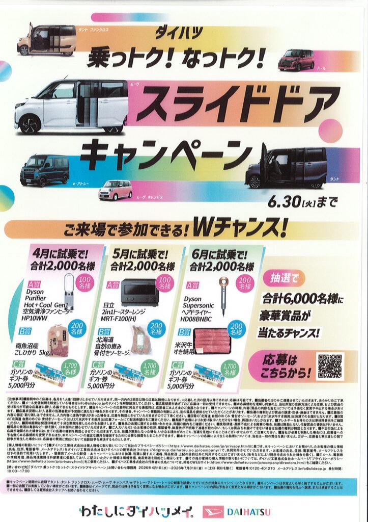 お知らせ | 【ダイハツ 乗っトク!なっトク!スライドドアキャンペーン🌟🌟6/30(火)まで】